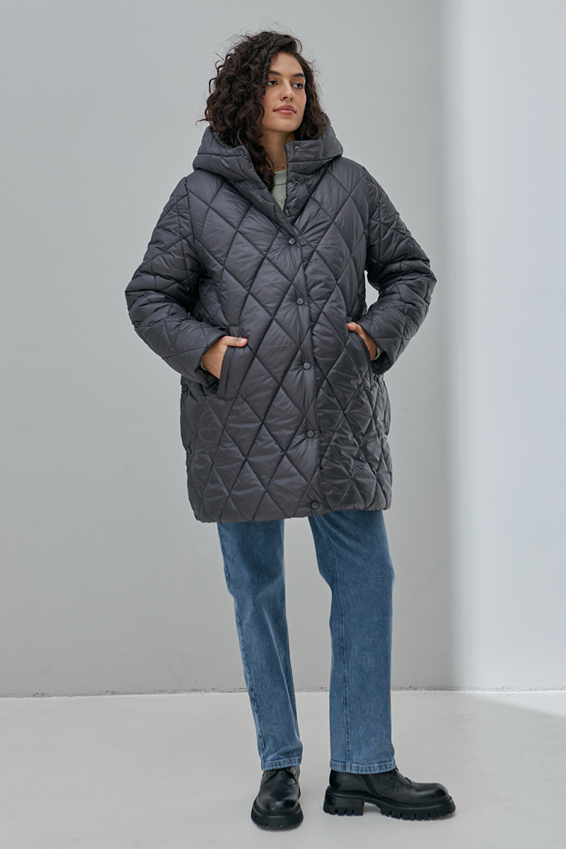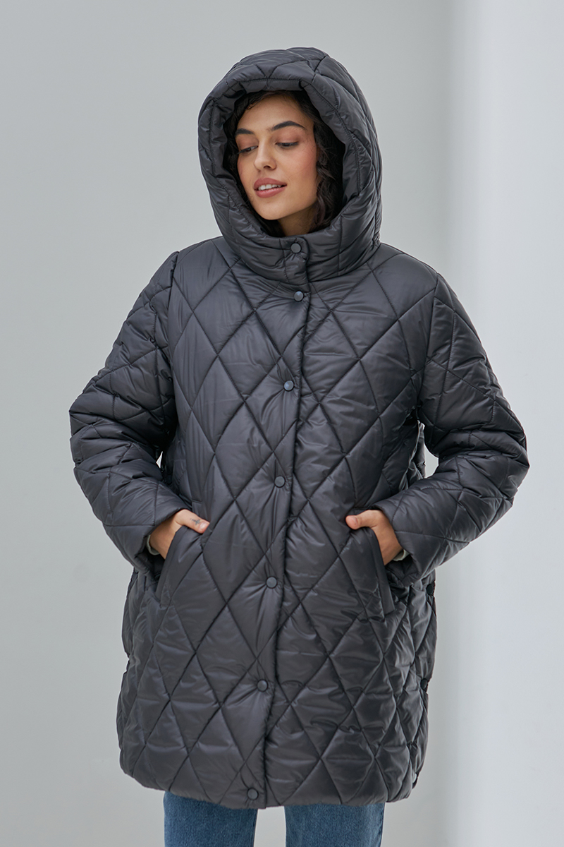 Тепла стьобана куртка для вагітних, на кнопках та із бічними розширювачами.