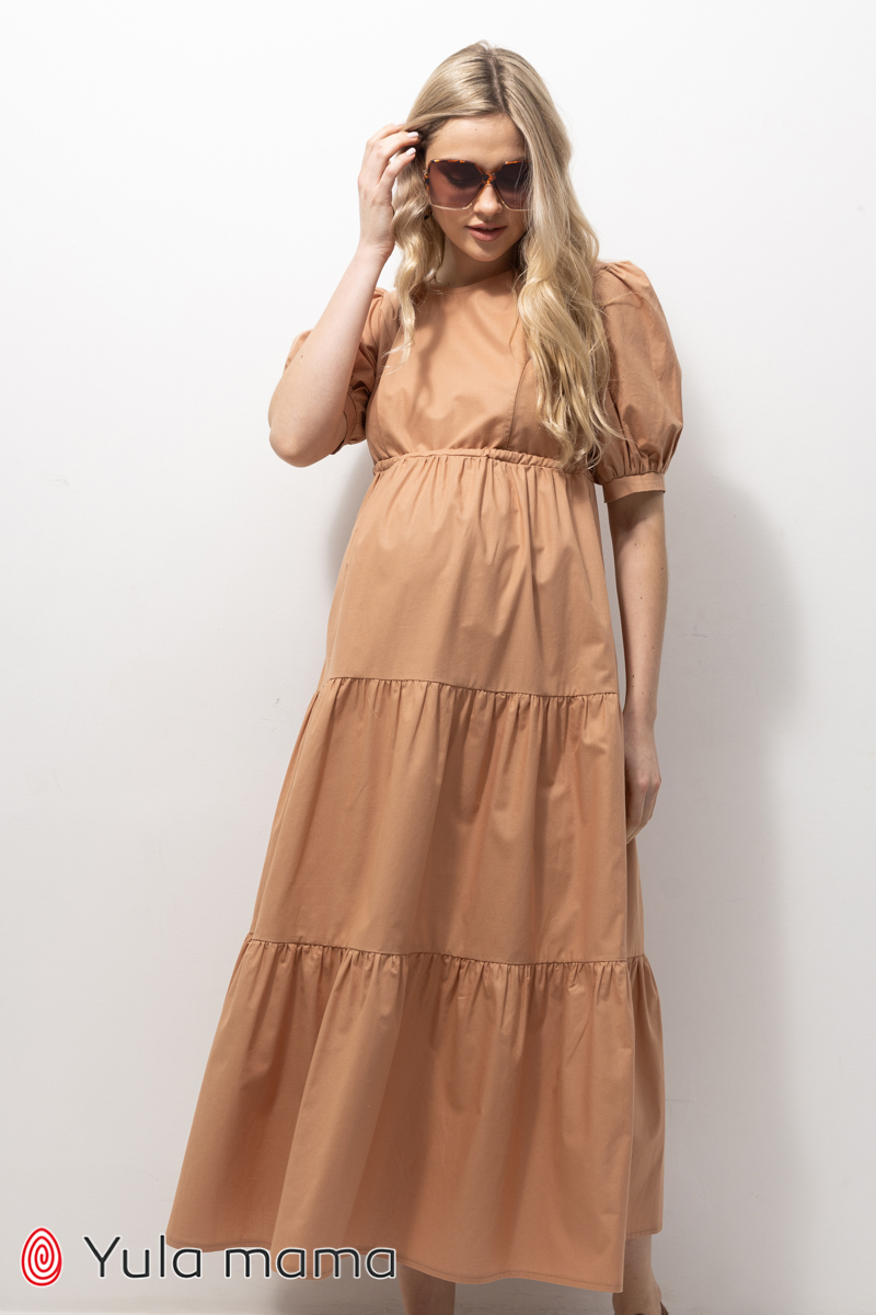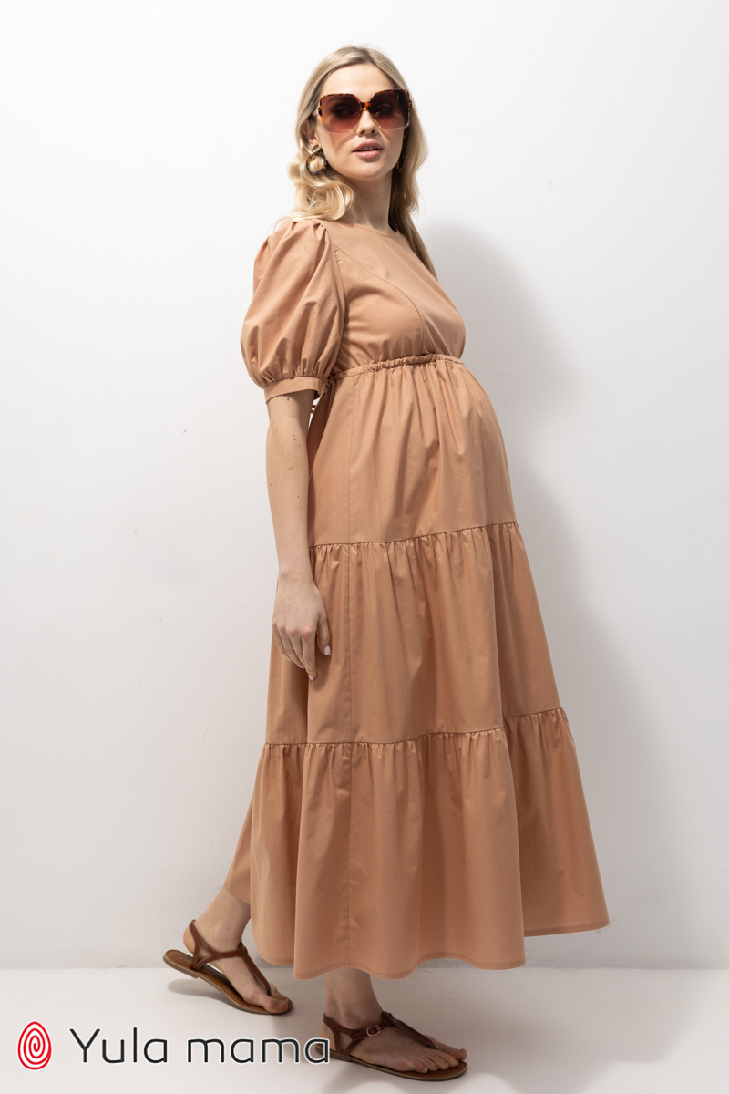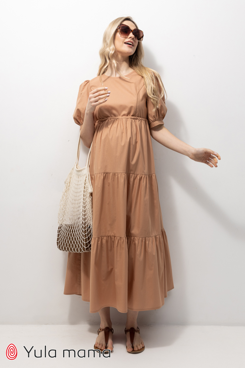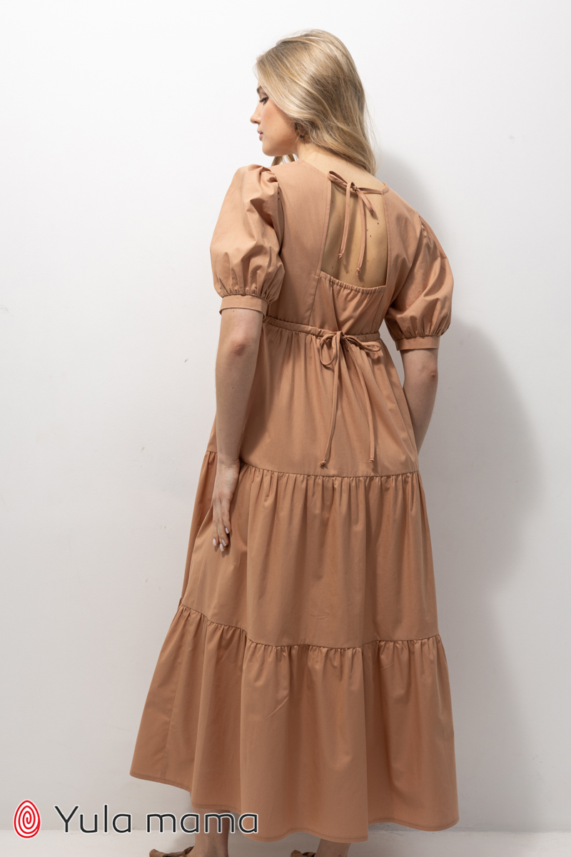 Довга ярусна сукня для вагітних та годуючих з попліну з відкритою спиною на зав'язках.