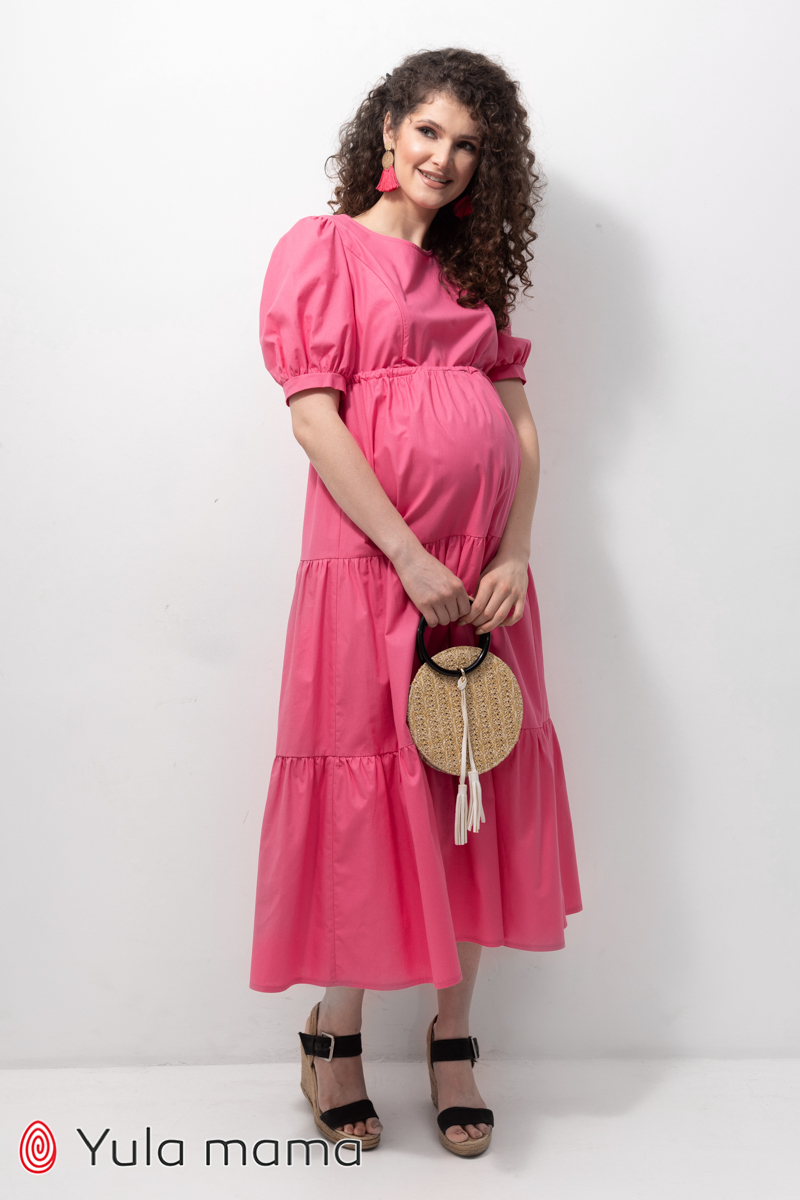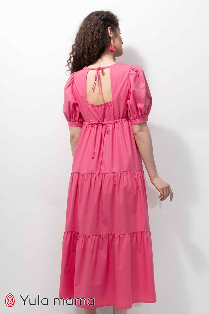 Довга ярусна сукня для вагітних та годуючих з попліну з відкритою спиною на зав'язках.