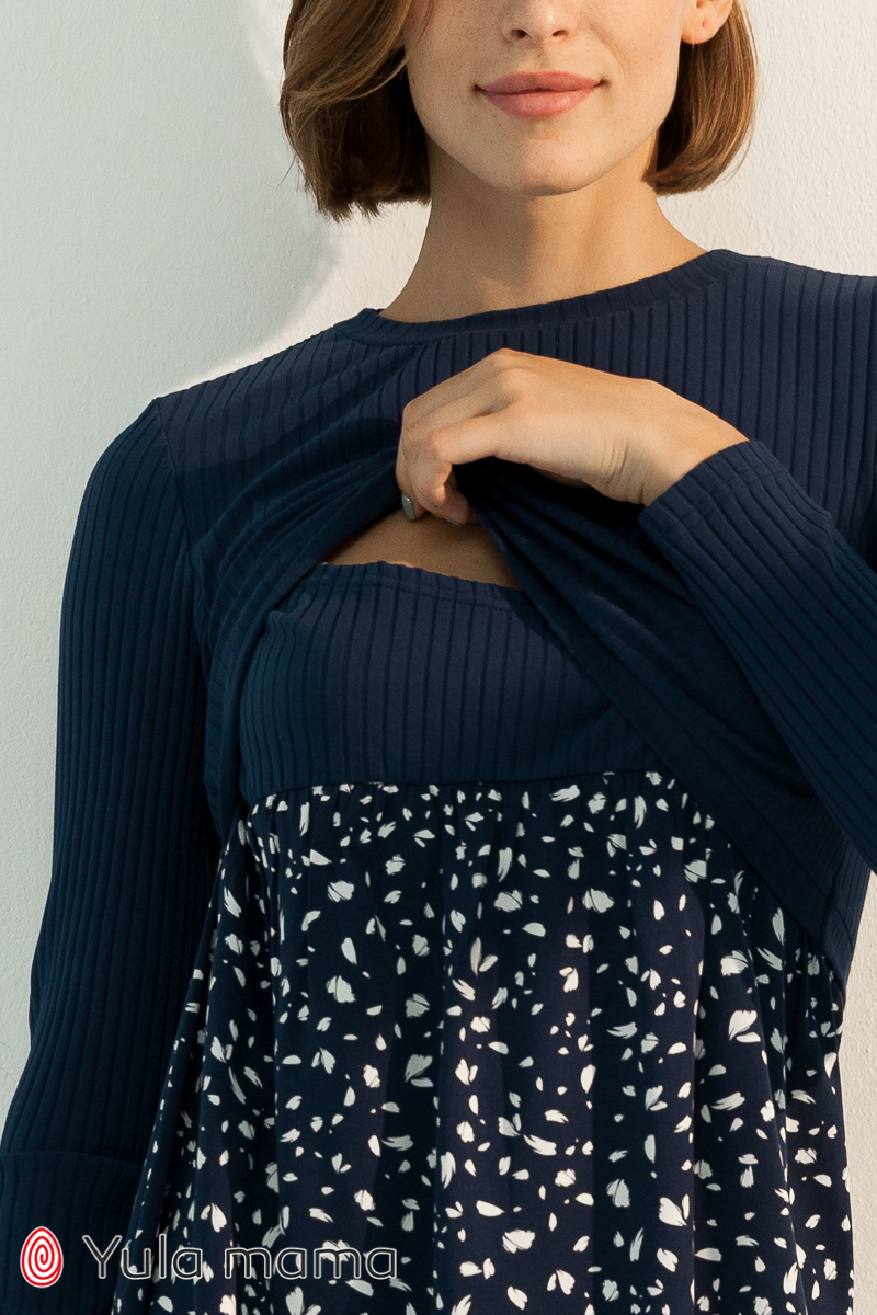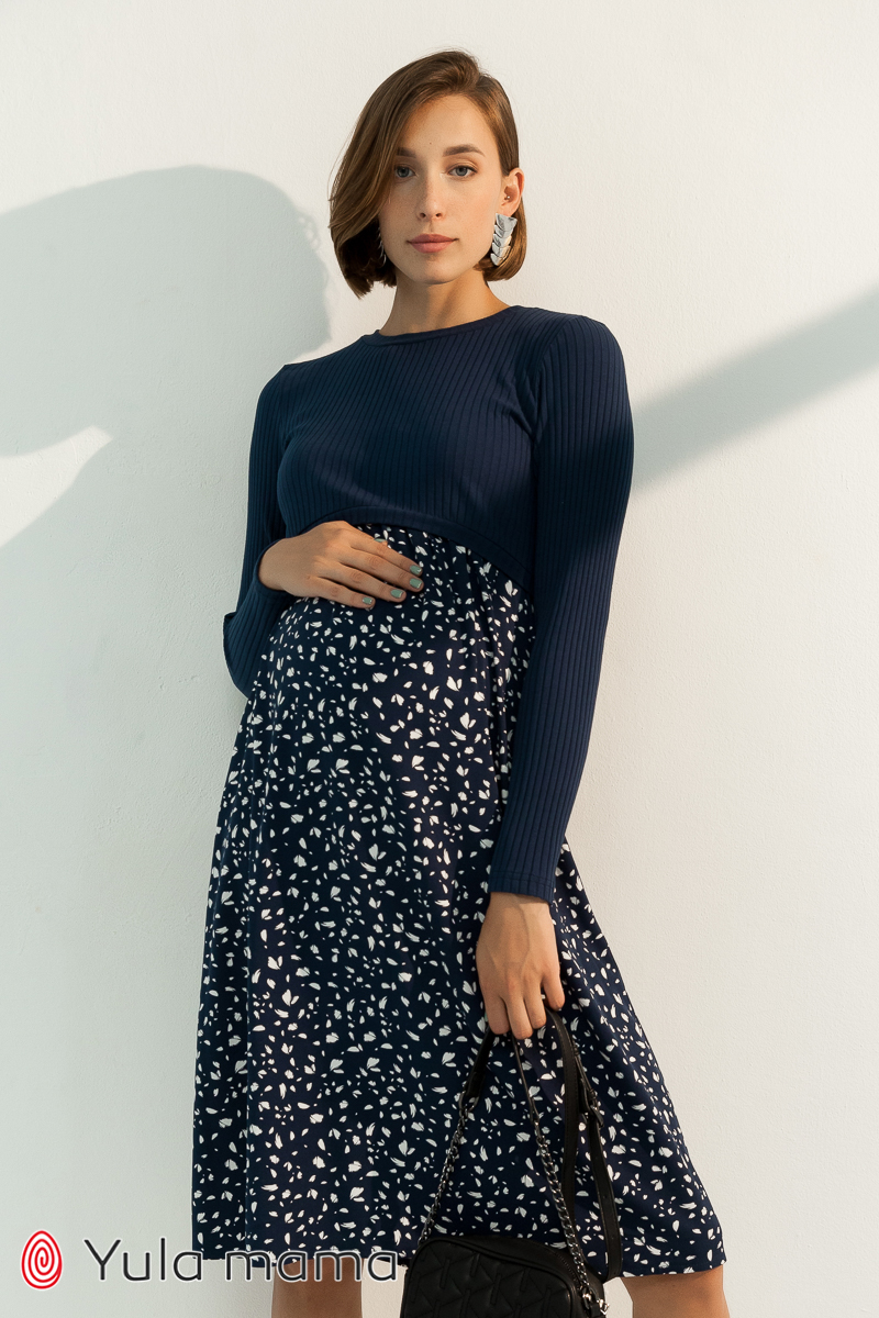 Платье для беременных и кормящих c трикотажным лифом и юбкой из плотного штапеля.