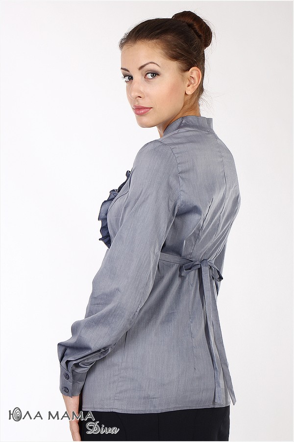 Изысканная блузка для беременных из меланжевой блузочной ткани, отрезная под грудью и зауженная к низу. Изюменкой модели являются кокетливые рюшки на груди. Регулировать посадку можно при помощи пояска на спинке. Цвет: синий меланж.