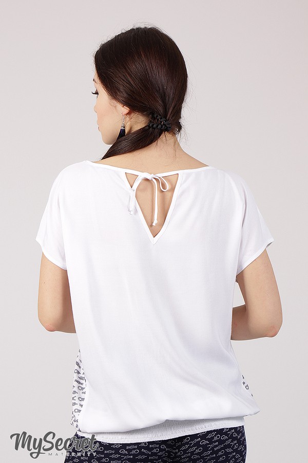 Легкая блузка для кормления в стиле «oversize» из сочетания принтованного и однотонного штапеля. Дышащая ткань, свободный фасон и удачно замаскированный секрет для кормления (потайные молнии в нагрудных рельефах) сделают эту модель для вас любимой для лета. Цвет: принт темно-синие узелки на светло-молочном + однотонный светло-молочный.