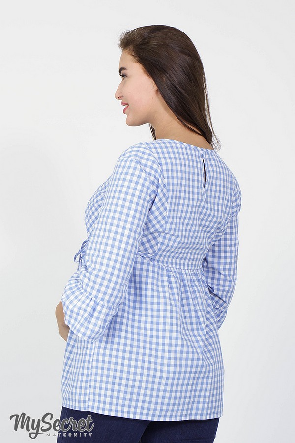 Легкая клетчатая блуза для беременных и кормящих из хлопка в стиле кантри. Натуральная ткань, свободный крой, рукав ¾ и кокетливые оборки— идеальное сочетание для теплой весны. Приятным бонусом будут потайные молнии, спрятанные в нагрудных рельефах, которые позволят кормить малыша приложив к этому минимум усилий. Цвет: бело-голубая клетка.