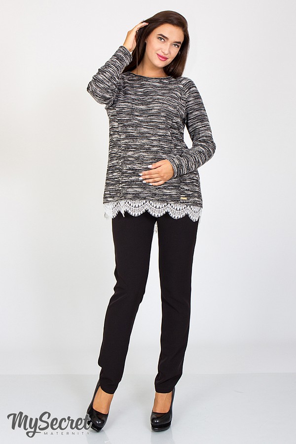 Стильные классические брюки для беременных модной длины "до щиколотки". Модель выполнена из стрейчевого коттона, который прекрасно держит строгую форму. Зауженный к низу фасон, в сочетании с заутюженными стрелками, прекрасно стройнит фигуру. На задней половинке брюк — прорезной карман-обманка. Бандажный пояс хорошо поддерживает животик и позволяет носить эту модель и после беременности. Цвет: черный.