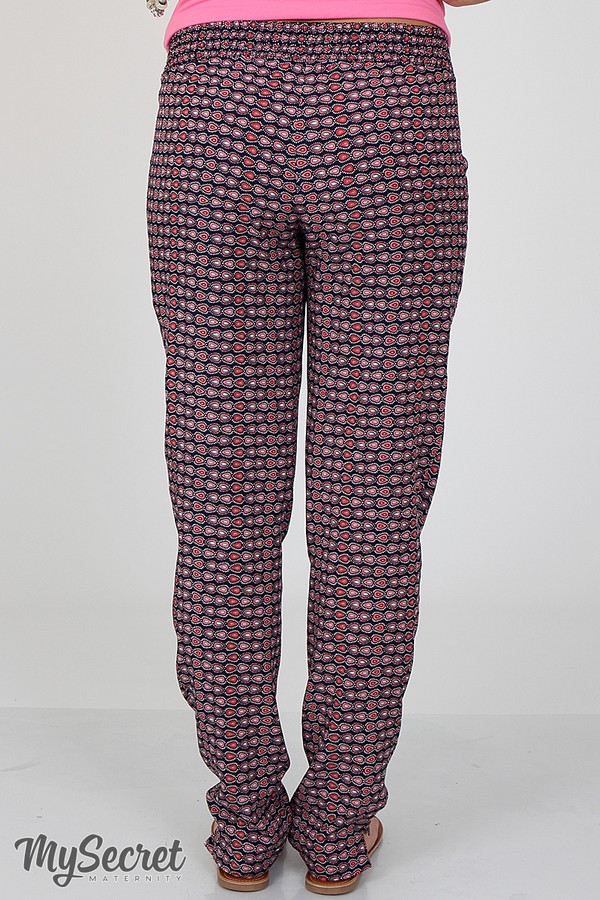 Удобные, свободные брюки для беременных из штапеля с принтом. Передние карманы с небольшой свободой облегания и зауженный к низу покрой хорошо маскируют фигуру и визуально стройнят. Пояс из основной ткани, перестроченной на тонкую резинку абсолютно не сковывает движений и не давит, а также он абсолютно универсален (подходит и после беременности). Цвет: принт «глазки» коралл на темно-синем.