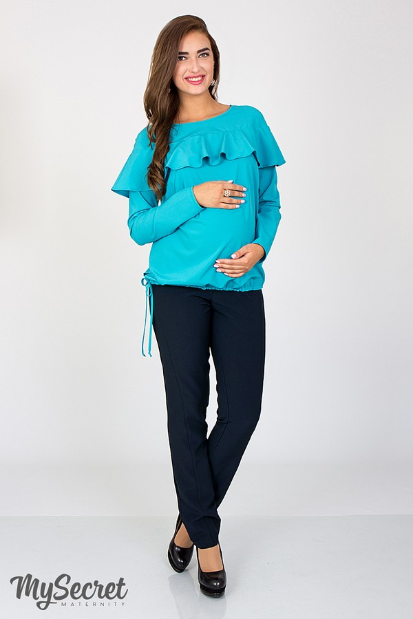 Узкие брюки для беременных из би-стрейчевой костюмной ткани. Игра рельефов на полочке и кокетка на спинке делают модель интересной, при этом визуально стройня фигуру. Пояс по спинке выполнен из основного материала, по переду - из эластичного трикотажного полотна с возможностью регулировки. Цвет: синий.