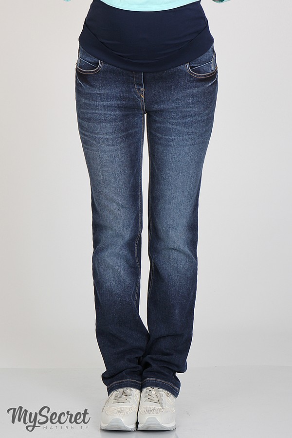 Прямые джинсы для беременных "Slim fit" из очень плотного стрейчевого денима. Классическая пятикарманная модель. Изюминка модели - декоративные подрезы на карманах на передней и задней части джинсов. Регулируемый высокий трикотажный пояс + трикотажный бандажный пояс - такая комбинация позволяет носить джинсы после беременности (предварительно убрав высокий трикотажный пояс). Цвет: темно-синий с потертостями.