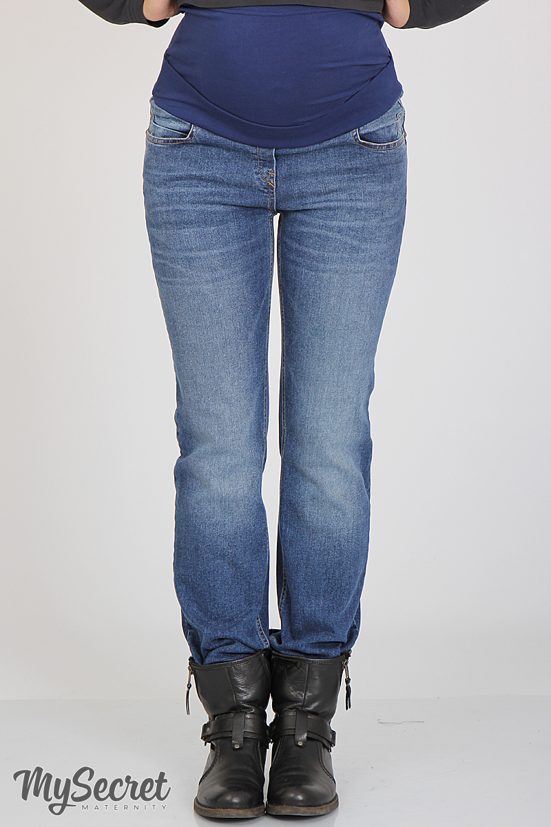 Прямые джинсы для беременных "Slim fit" из очень плотного стрейчевого денима. Классическая пятикарманная модель. Изюминка модели - декоративные подрезы на карманах на передней и задней части джинсов. Регулируемый высокий трикотажный пояс + трикотажный бандажный пояс - такая комбинация позволяет носить джинсы после беременности (предварительно убрав высокий трикотажный пояс). Цвет: синий с потертостями.