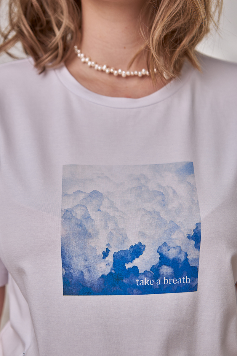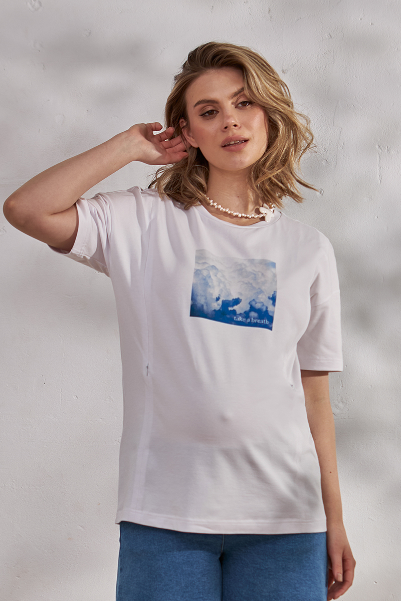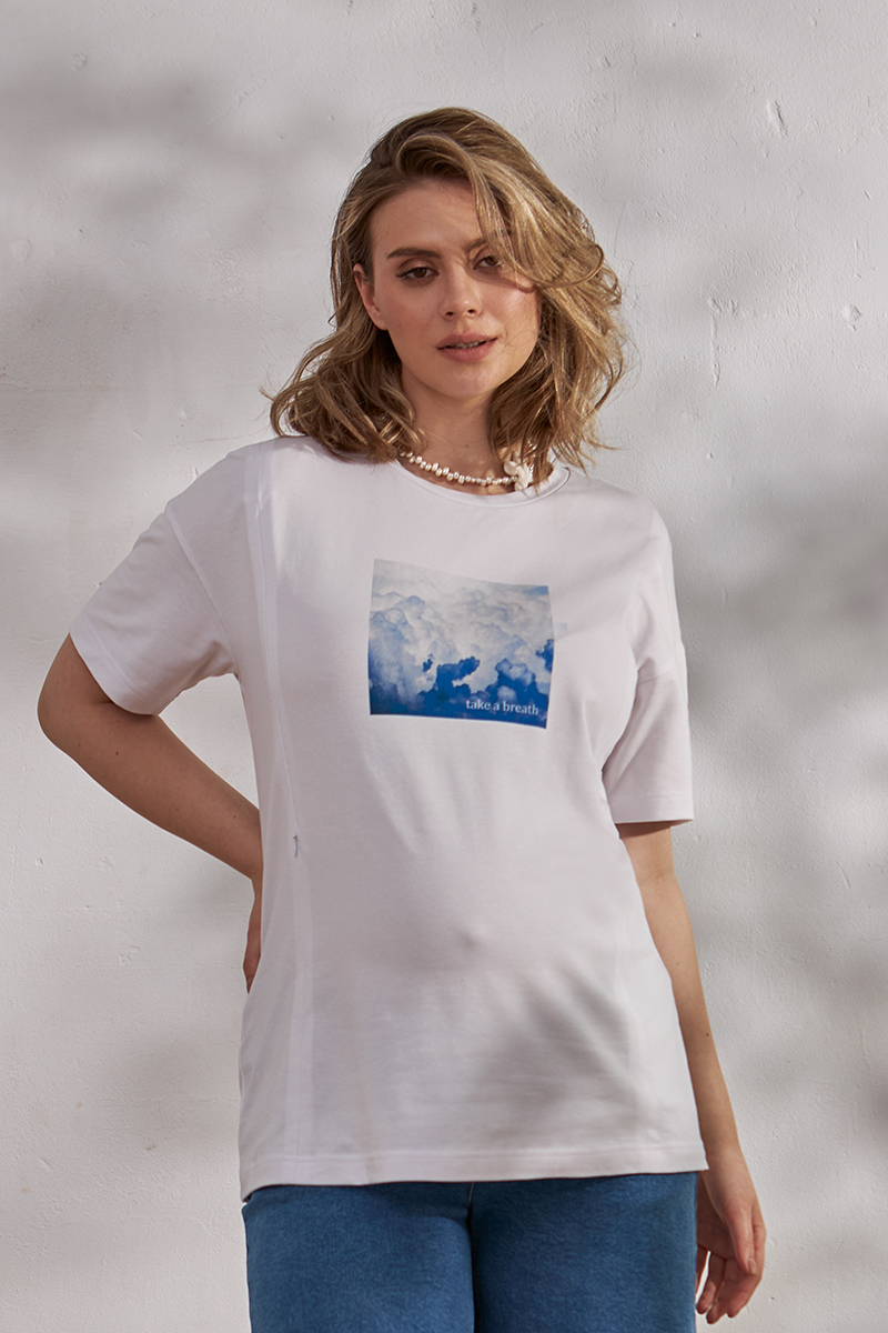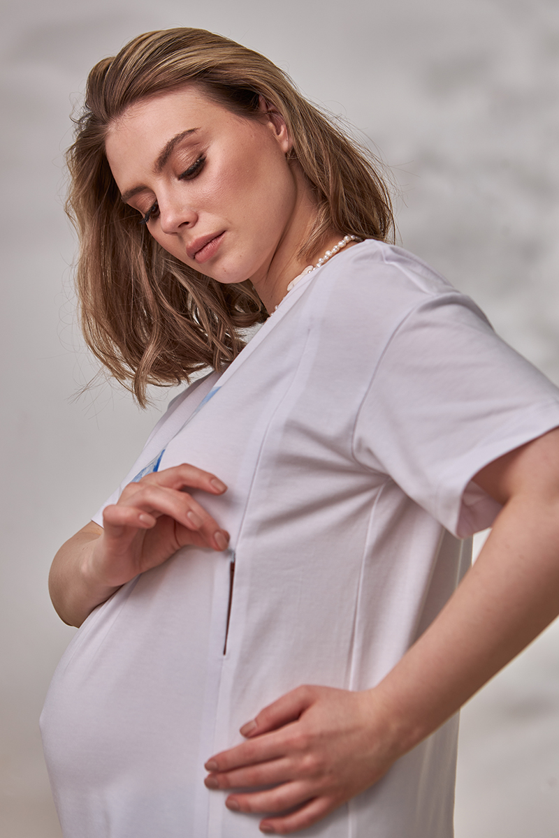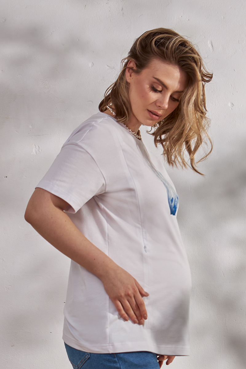 Стильна футболка для вагітних та годуючих з яскравим принтом.
