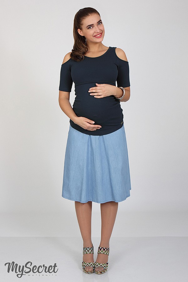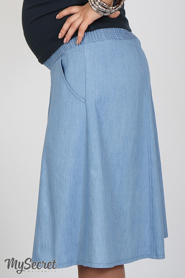 Незаменимая вещь в базовом гардеробе — юбка-шестиклинка для беременных из тонокго легкого джинса длиной миди (чуть ниже колена), с удобными карманами. Пояс из основной ткани, перестроченной на тонкую резинку, абсолютно не сковывает движений и не давит, а также он абсолютно универсален (подходит и после беременности). Цвет: голубой джинс.