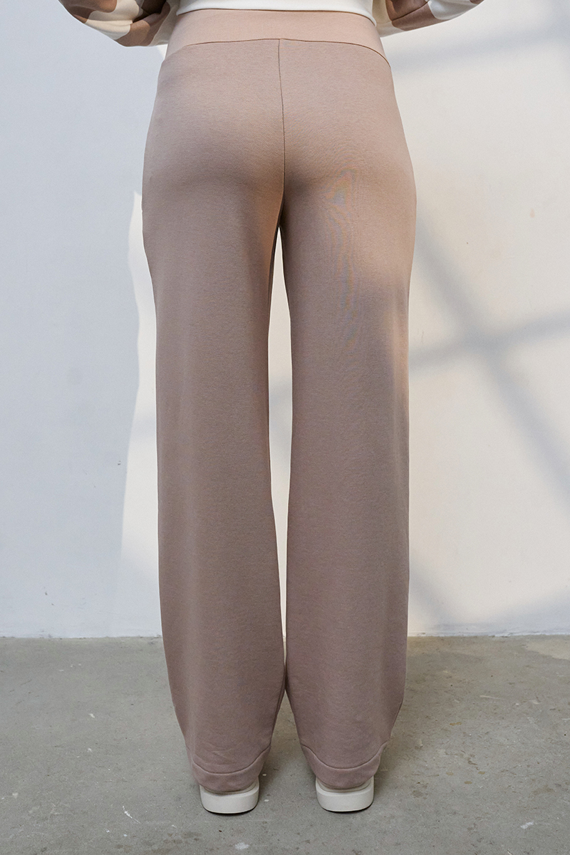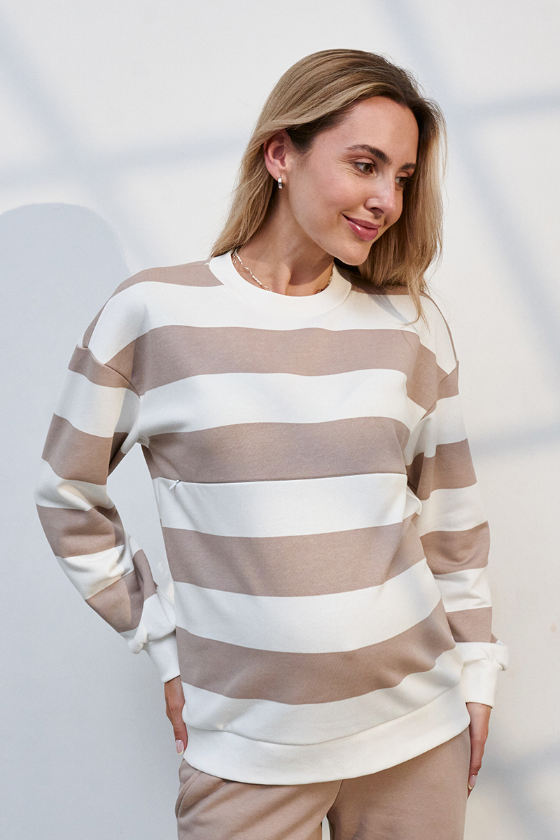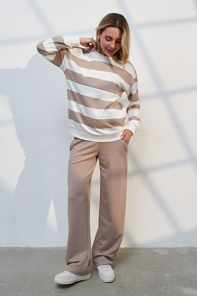 Трендовий костюм зі смугастим світшотом та прямими брюками із щільного трикотажу.