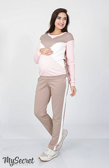 ХИТ СЕЗОНА! Ультрамодный костюм для беременных и кормящих в стиле casual из трикотажа джерси на все случаи жизни. Свитшот в стиле color-block выполненный в трёх цветах так и притягивает взгляд, а секреты для кормления очень удачно замаскировались в нагрудных рельефах (незаметные потайные молнии). Контрастные лампасы на брюках визуально стройнят фигуру, а широкая резинка на поясе не будет сдавливать растущий животик. Цвет св.синий-голубой-молоко.