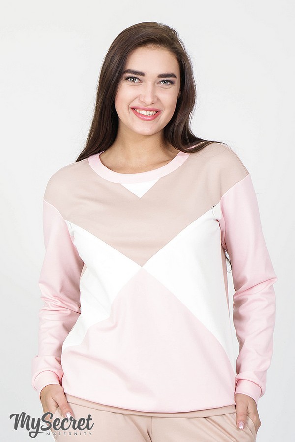ХИТ СЕЗОНА! Ультрамодный костюм для беременных и кормящих в стиле casual из трикотажа джерси на все случаи жизни. Свитшот в стиле color-block выполненный в трёх цветах так и притягивает взгляд, а секреты для кормления очень удачно замаскировались в нагрудных рельефах (незаметные потайные молнии). Контрастные лампасы на брюках визуально стройнят фигуру, а широкая резинка на поясе не будет сдавливать растущий животик. Цвет нюд-молоко-пудра.