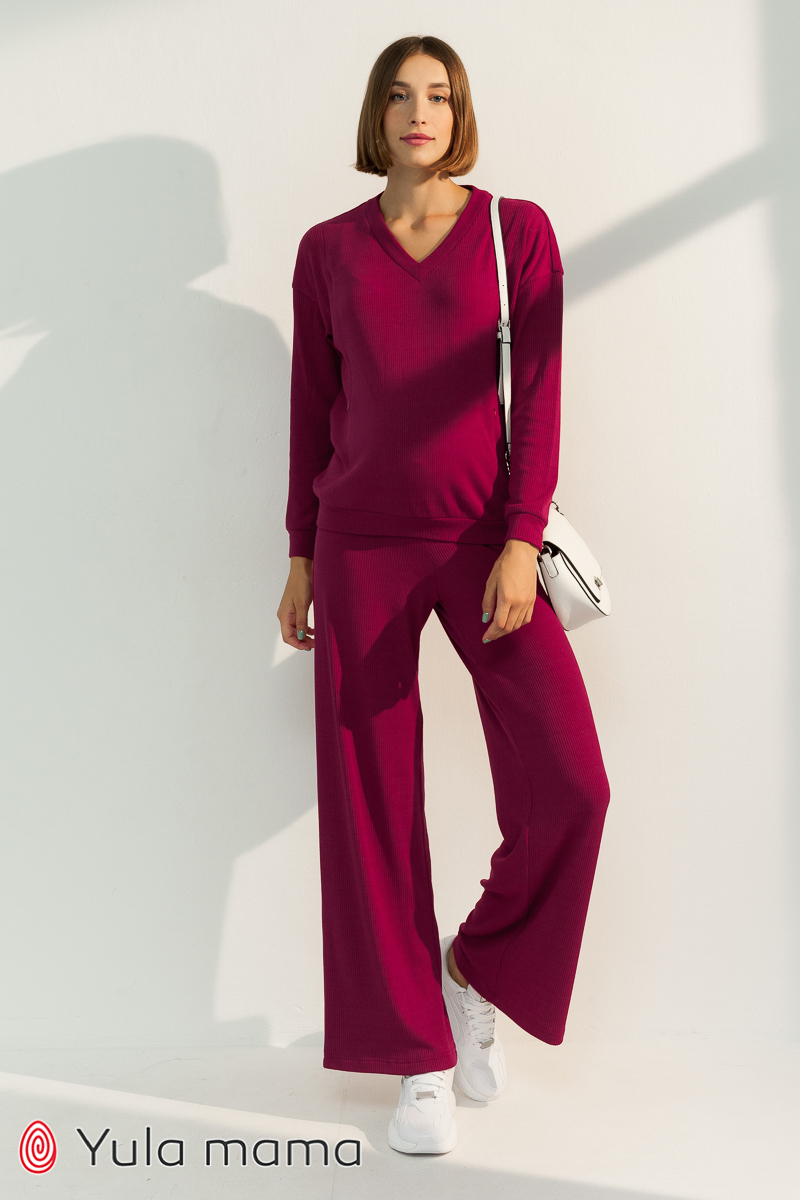 Стильний костюм із трикотажу для вагітних та годуючих зі штанами палаццо та світшотом з V-подібним вирізом.