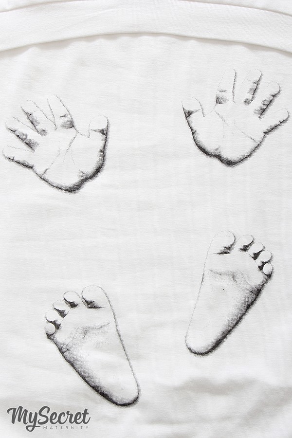 Облегающая майка для беременных из однотонного хлопкового трикотажа. Круглая горловина и подрез под грудью обработаны узкой планкой, внизу широкая планка-резинка. На животе веселая накатка "Ручки-ножки". Цвет: молочный.