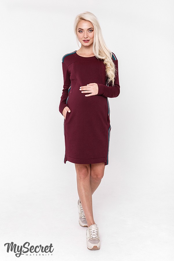 Хит СЕЗОНА! Ультрамодное платье-туника для беременных и кормящих прямого силуэта из теплого трикотажа трехнитка с начесом, с отделкой из трикотажной тесьмы в полоску. Секрет кормления - потайные молнии в нагрудных рельефах. Впереди карманы в рельефах и небольшие разрезы с перепадом длины линии низа. Цвет: марсала.