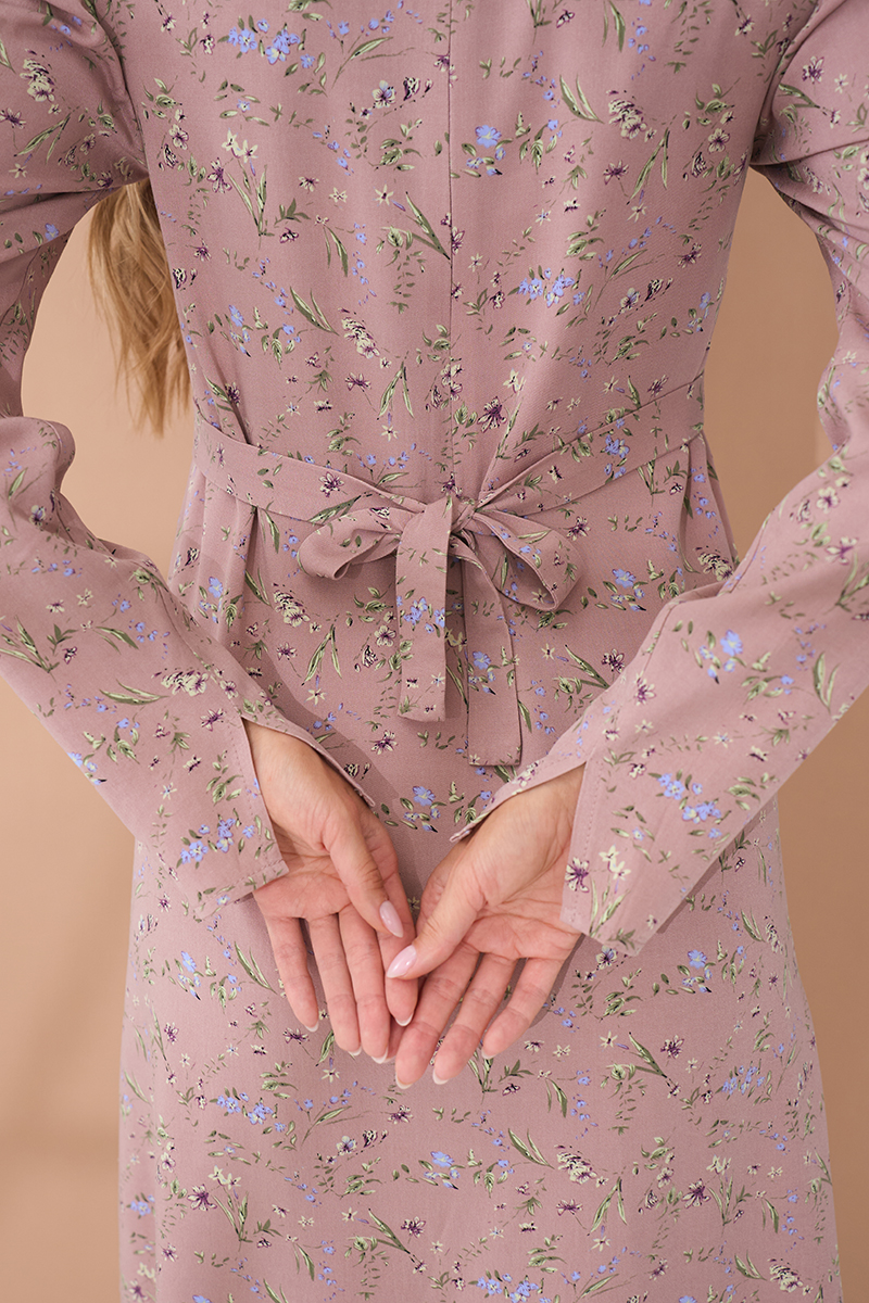 Оздоблення: рукава-буфи й ефектний розріз на спідниці, зміщений у лівий бік.