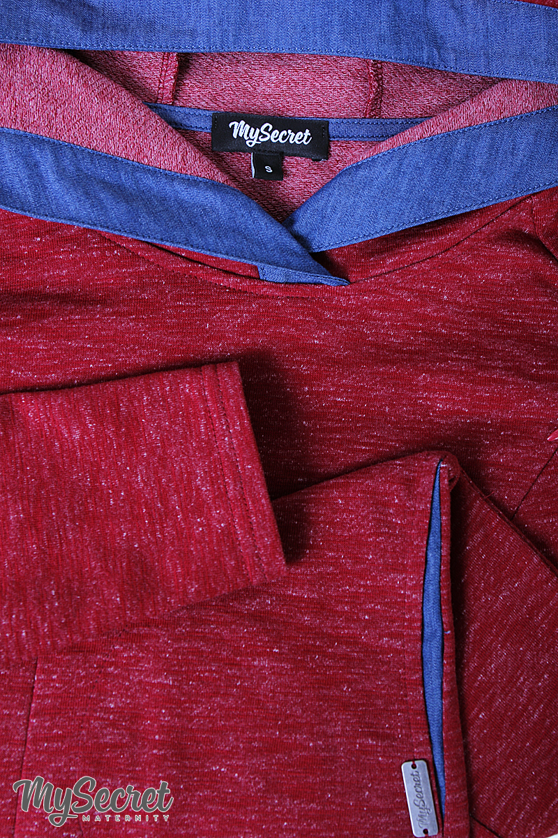 Молодежное платье для беременных и кормления из тонкого трикотажа трехнитка с отделкой из тонкого джинса. Расклешенный к низу фасон, и яркие цветовые акценты (отделка капюшона, низа изделия, карманов из джинса) задают озорной настрой и выглядят очень трендово. В нагрудных рельефах спрятан секрет кормления — потайные молнии. Цвет: бордовый меланж + синий джинс.