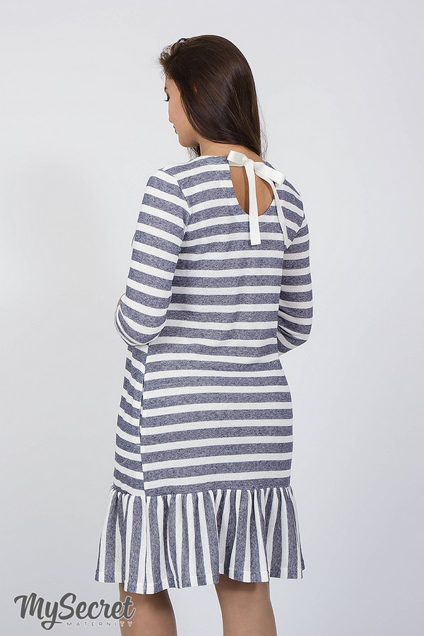 Платье-колокольчик из тонкой полосатой трехнитки для беременных и кормящих мам - как будто специально создано для этой весны. Ультрамодный фасон с озорной оборкой по низу изделия и изящным вырезом-капелька на спине, в сочетании со свободным кроем, дарящим свободу движений и скрадывающим округлости, и, конечно, наличием секрета кормления (потайные молнии в нагрудных рельефах) - это 100% хит и must have этого сезона! Цвет: полоска сине-молочная.