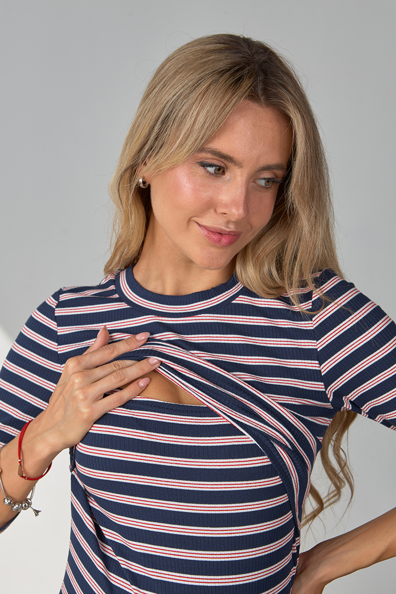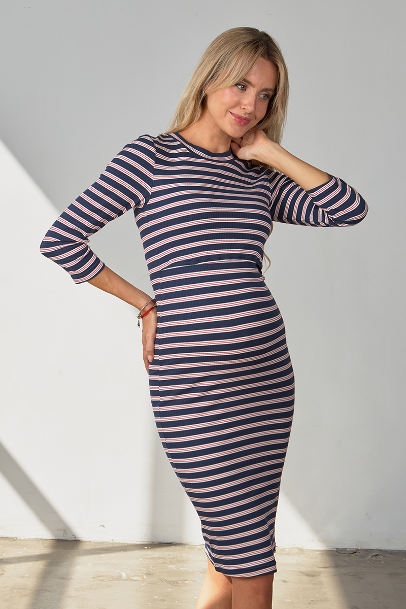 Плаття міді для вагітних та годуючих із трикотажу-резинка в смужку.