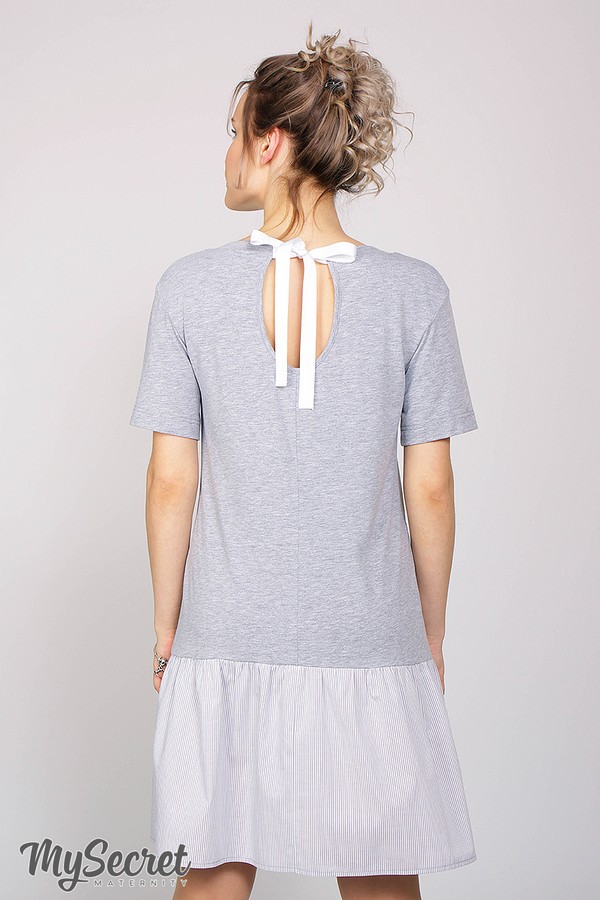 Отличный вариант на каждый день - модное платье-футболка для беременных и кормящих из комбинации хлопкового трикотажа и рубашечной ткани в полоску. Свободный верх из трикотажа отлично маскирует и адаптируется к изменяющимся формами фигуры, а оборка по низу из полосатого поплина и капелька на спинке с завязками из репсовой тесьмы отлично дополняют и украшают изделие. Незаметный и такой удобный секрет комрления - потайные молнии в нагрудных рельефах. Цвет: серый меланж трикотаж с отделкой из серо-белой полоски.