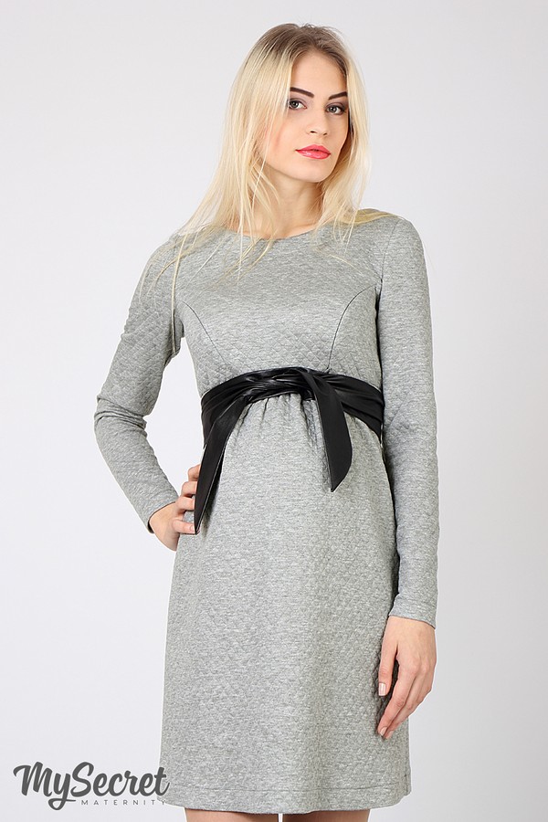 Молодежное платье для беременных и кормления из теплого трикотажа «стежка» модного фасона: облегающий лиф и свободная юбка с присборкой. Платье имеет секрет для кормления в виде потайных молний в нагрудных рельефах. Благодаря подобранным аксессуарам эту модель можно носить как в спортивном стиле, так и в женственном. Внимание: пояс-кушак из искусственной кожи в комплект не входит, при желании заказывается отдельно. Цвет: серый меланж.