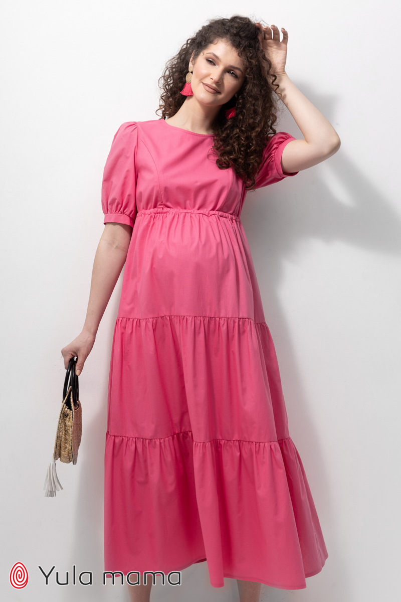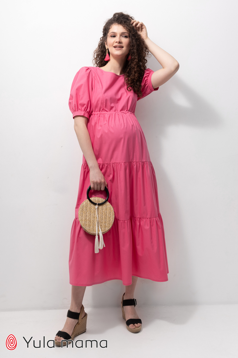 Довга ярусна сукня для вагітних та годуючих з попліну з відкритою спиною на зав'язках.