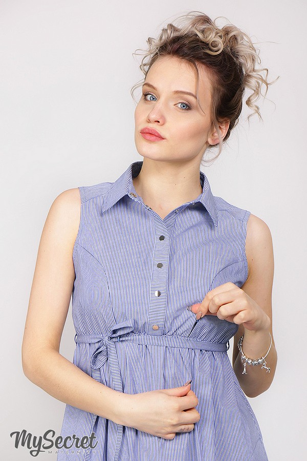 Вот уже несколько лет возглавляющее модный олимп платье-рубашка для беременных и кормящих из тонкого поплина в полоску. Лиф облегающий с рубашечным воротничком и планкой, эффектно украшенной металлической фурнитурой. В нагрудных рельефах спрятаны потойные молнии - наш маленький секрет для кормления. Свободный низ дает достаточно объема для изменяющихся форм и дарит прохладу в летнюю жару. Есть удобные карманы. Цвет: белая полоска на темно-голубом фоне