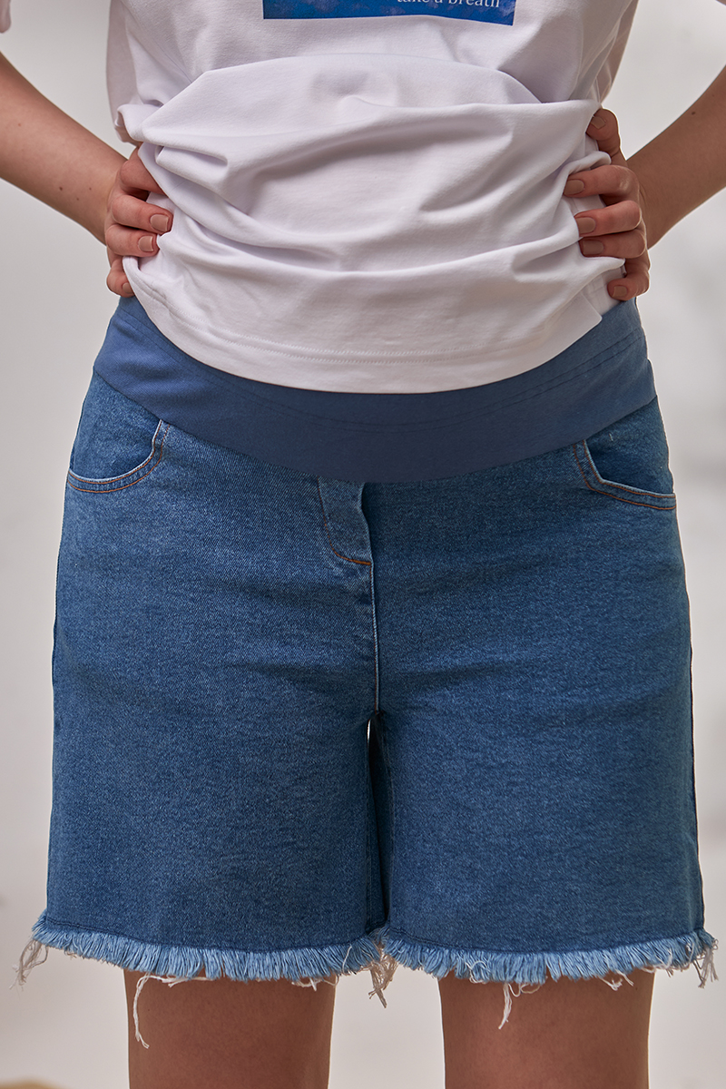 Вільні шорти для вагітних у повсякденному стилі із джинсу з відкритими зрізами внизу.