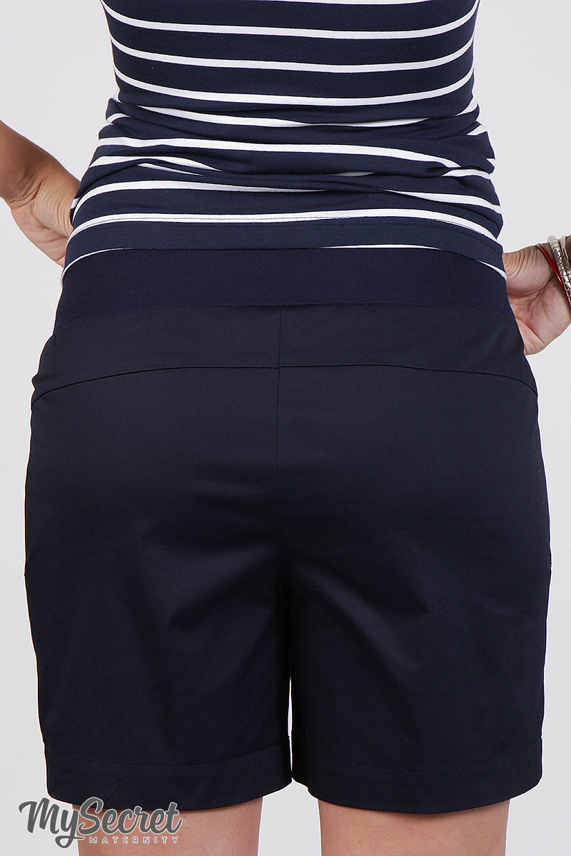 Свободные шорты из стрейч-коттона средней длины, в минималистичном стиле. Впереди удобные карманы, с переда на спинку уходит круговая кокетка. Благодаря двойной подгибке шорты можно подварачивать, тем самым регулируя длину. Универсальный бандажный пояс позволяет носить модель после беременности. Цвет: темно-синий.