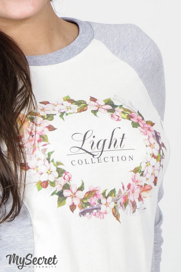 Добавьте красок в свою жизнь - наш яркий молодежный свитшот для беременных и кормящих поможет вам в этом. Модель выполнена из трикотажа двунитка двух цветов: полочка молочного цвета с ярким принтом «Веночек», осстальные детали - серый меланж. Секрет кормления: потайные молнии в нагрудных рельефах.