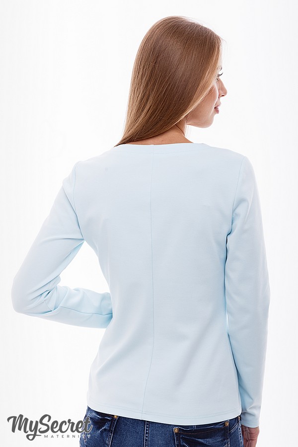 Новинка! Облегающий свитшот только для кормящих, из трикотажа джерси. Секрет кормления (встречные потайные молнии) удачно спрятался под игривым воланом, ассиметрично расположенным на полочке. Может подойти для беременности на ранних сроках. Цвет: небесно-голубой.