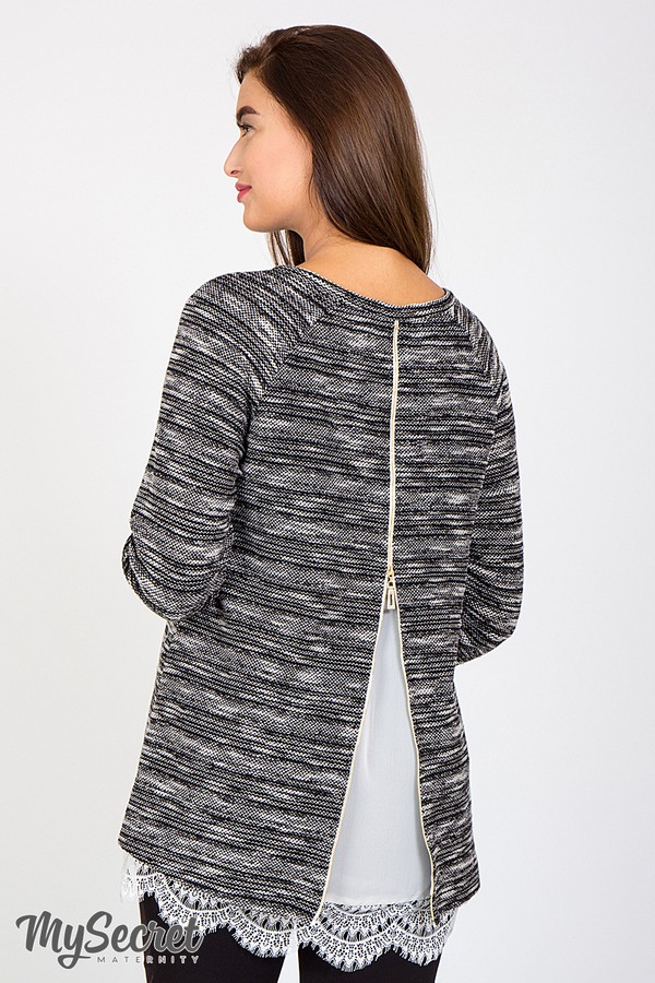 Изысканная туника для беременных и кормящих из трикотажа букле с отделкой. Свободный А-образный силуэт отлично маскирует фигуру, а потайные молнии в нагрудных рельефах делают модель универсальной. Сочетание теплого трикотажа с отделкой из шифона и кружева шантильи создают невероятно красивый образ. А молния на спинке несет не только декоративную, но и функциональную нагрузку - при необходимости увеличение объема изделия. Цвет: черно-молочной букле с молочной отделкой.